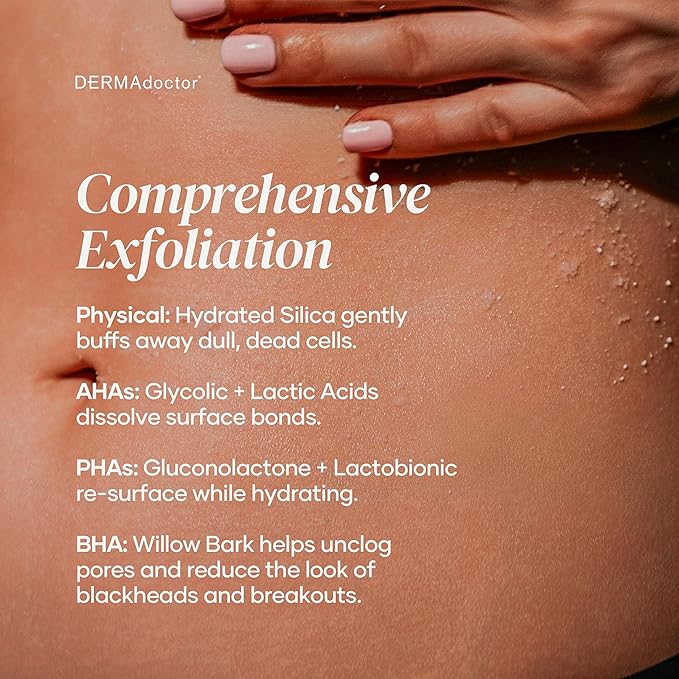 - DEEP EXFOLIATION POWER: Our exfoliating body scrub doubles as a gentle peel and microdermabrasion, clearing pores, improving skin tone, and treating keratosis pilaris arms, legs, and overall body texture.