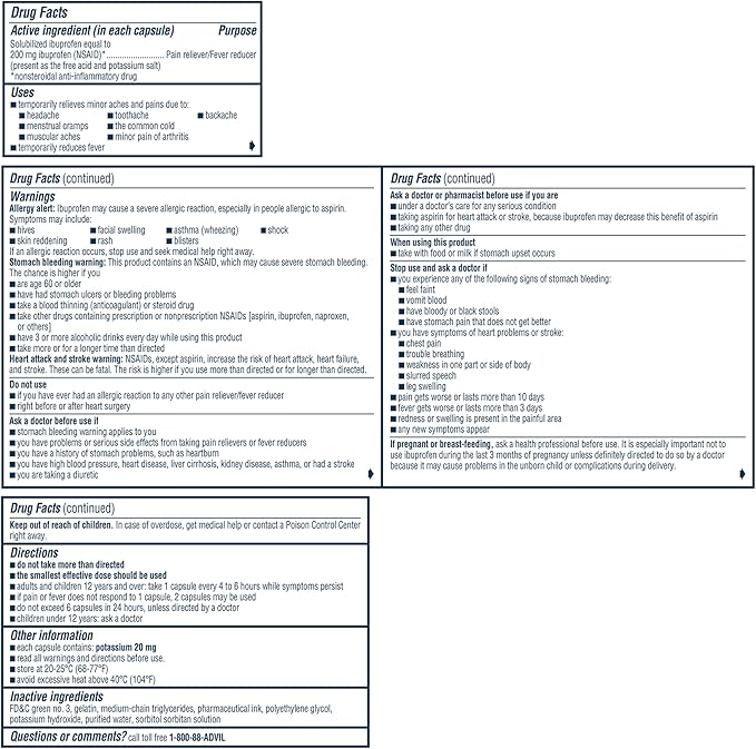 - One bottle of 200 Advil Liqui-Gels minis Pain Reliever and Fever Reducer Liquid Filled Capsules, Pain Medicine for Adults with Ibuprofen 200mg for Pain Relief