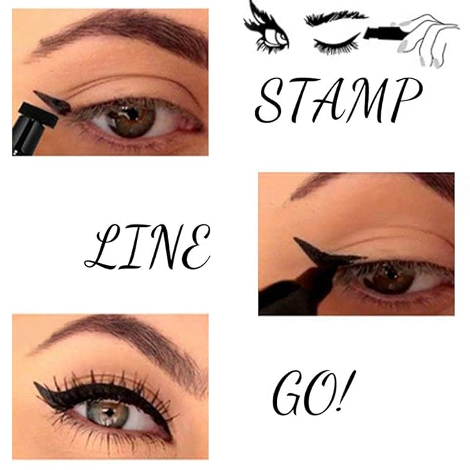 - STAMP AND LINE –Double-headed Design. one end for stamping and the other has a very fine tip for defining the rest of the eye with precision. You can even use the size of the liner as a stencil for a more dramatic makeup
