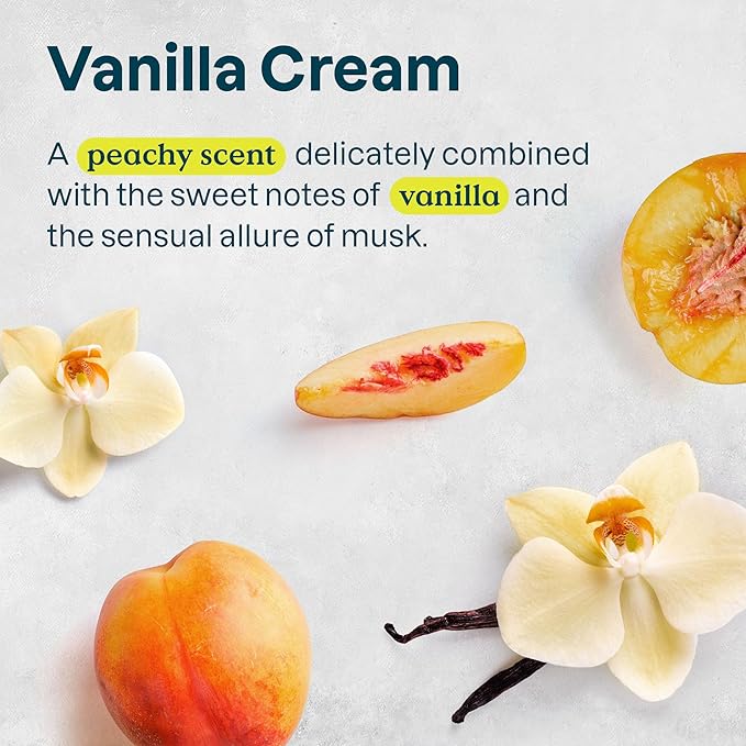 - VANILLA CREAM SCENT: This body wash has a soft, comforting fragrance where juicy peach blends with sweet vanilla, leaving skin gently scented. A warm, relaxing ritual for women, men, or anyone seeking a more mindful wash experience.