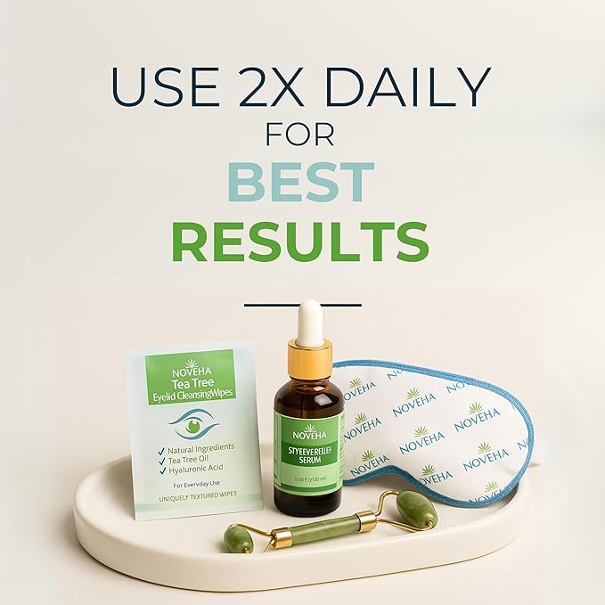 NOVEHA 60PCs Tea Tree Oil Eyelid & Lash Wipes | With Hyaluronic Acid, Green Tea & Chamomile For Blepharitis, Itchy & Stye Eyes, Individually Wrapped, Natural Eyelash Makeup Remover & Daily Cleanser