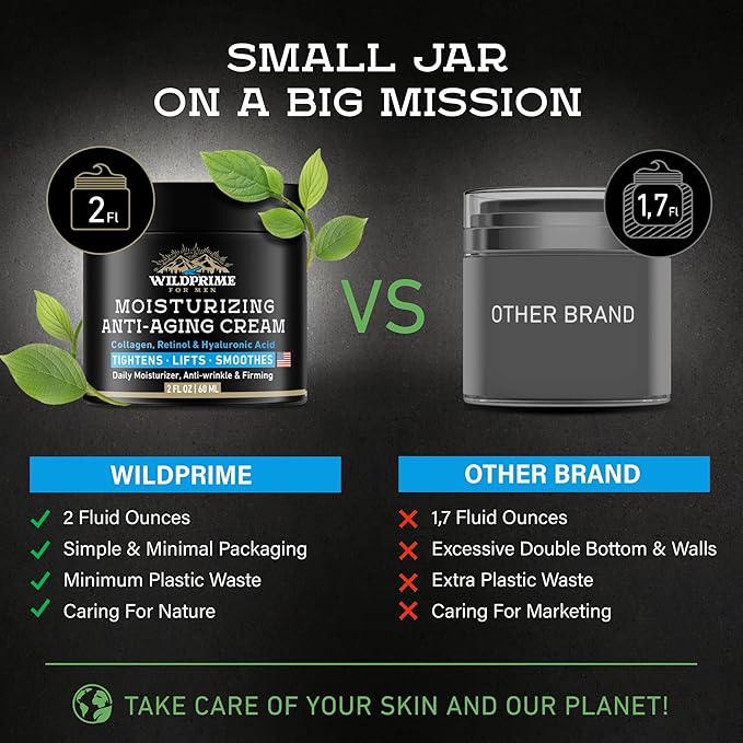 - SMART NATURAL FORMULA - Our anti-aging face moisturizer has a pleasant non-greasy texture that does not clogs up pores. It contains no irritating fragrances and colors and works for all skin types, so you don't have to bother about exhausting researches of what would be effective for you exactly. WildPrime simply does what's promised, and that's why we are trusted by men all across the Country.