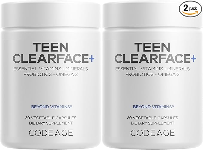 Codeage Teen Clearface Adolescent Face, Skin & Pimples, Vitamins A, C, D3, E, Pantothenic Acid, Niacin, Zinc Supplement Teenagers, Probiotics, L-Lysine, Omega-3, Oily Skin, Pores, Spots - 2 Pack