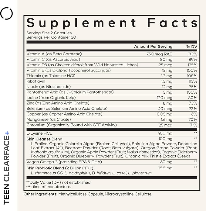 - L-lysine & Vegan Omega-3: This nutritional capsule blend for adolescent also combines 400mg of L-Lysine HCL, L-Proline, and 60mg of vegan omega-3 fatty acids. Nutrition may be used as part of a pimple serum and face cleanser routine.