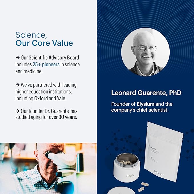 - UNLOCK THE POWER OF HEALTHY AGING WITH BASIS - At Elysium Health, we are pioneers in the science of aging, led by our co-founder Leonard Guarente, Ph.D., who has dedicated over three decades to researching how to age healthily. Basis is a cutting-edge NAD+ supplement designed to boost and elevate NAD+ levels by an astounding 40%, targeting aging at the cellular level. It’s no surprise that we’ve sold over 4.5 million bottles and that TIME magazine recognizes Basis as "the supplement experts take.
