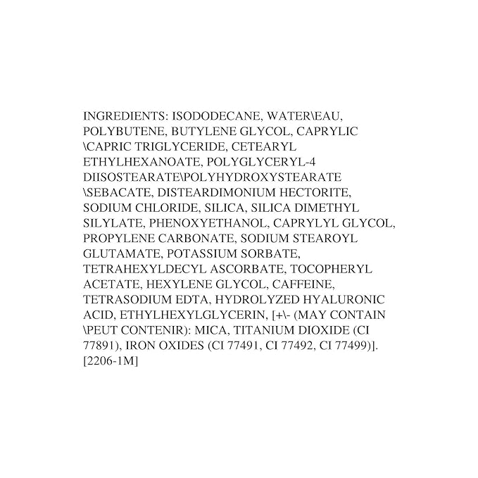 - Pigmented liquid formula infused with caffeine, sodium hyaluronate, and Vitamin C
