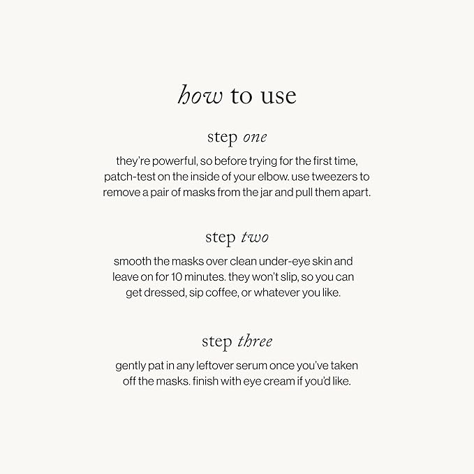 - How to Use: These under eye mask patches are easy to put on and designed not to slip—leave them on for 10 minutes to visibly improve the look of puffiness, dark circles, crow’s-feet, lax skin, wrinkles, and more.