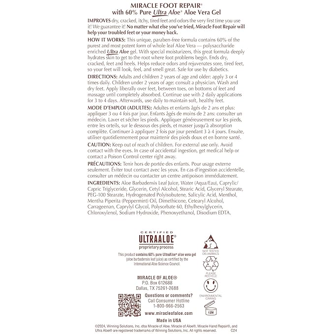 - 60% PURE ULTRA ALOE FORMULA - Our Miracle Foot Repair Cream's 60% ultra aloe concentration enhances softening, even on the toughest calloused areas.