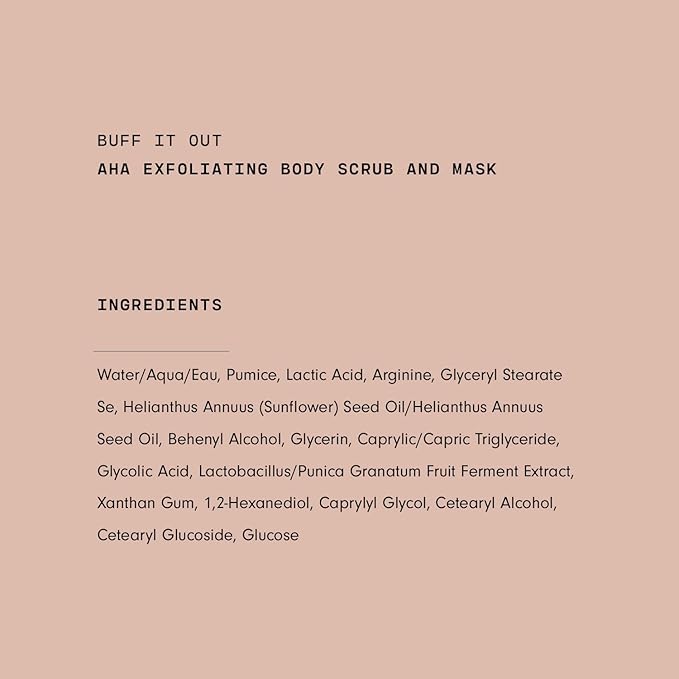 - Buff Up Your Body Care - This creamy body scrub exfoliator contains gentle AHAs (brightening lactic acid and resurfacing glycolic acid) to remove dead skin, smooth rough texture, and help improve the appearance of discoloration for fresher, brighter-looking skin.