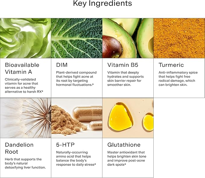- REAL INGREDIENTS, REAL RESULTS - By combining DIM, Vitamin B5, Vitamin A, Glutathione, Turmeric, Milk Thistle, and Digestive Enzymes your body can optimize digestion & detoxification while regulating the hormones that lead to acne.