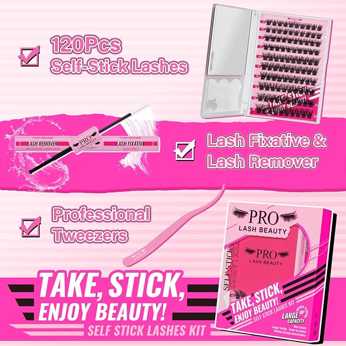 - PRO Self Adhesive Eyelashes Kit: DIY Self-adhesive eyelash extension kit includes 120pcs self stick cluster lashes 10-18mm mixed length and 1 lash tweezers, lash Fixative lash remover . And these reusable self adhesive lash clusters can be used many times with proper care.You can choose the right combination of lengths to suit your needs.