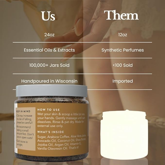 - Handpoured in WI: Every vanilla coffee scrub comes with a cute little spoon, is infused with Vanilla Oleoresin Oil, and is carefully handpoured by our team in Madison, Wisconsin