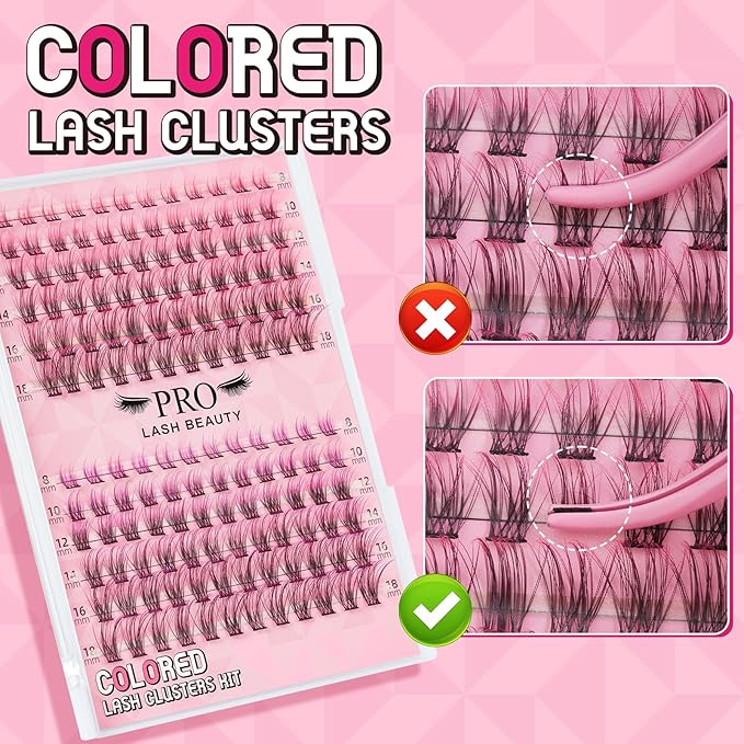 - 144 Pcs Colored Cluster Lashes: The hottest Cluster lashes among the social media are avaiable now! Different from other brands, PRO LashBeauty can provide 144 pcs in one tray! Mix Length from 8mm to 18mm. You can get more lashes and use more times.