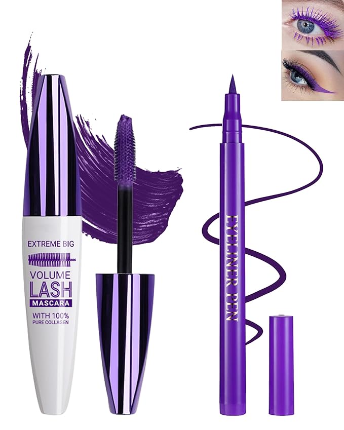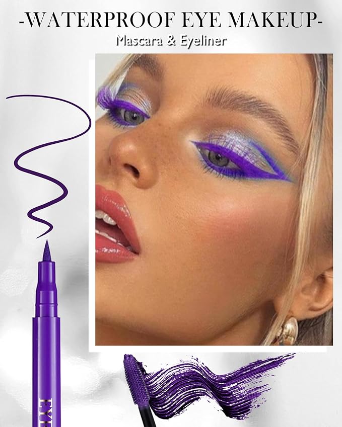 - Colored Mascara & Eyeliner Makeup Duo - The waterproof mascara can lengthen your eyelashes with a natural curl, no falling, and gently adds volume effortlessly. Our precise liquid eyeliner is intense color and its soft felt tip draws defined lines effortlessly, delivering an impressed, deep-eyed look. Which stays perfect through sweat and tears.
