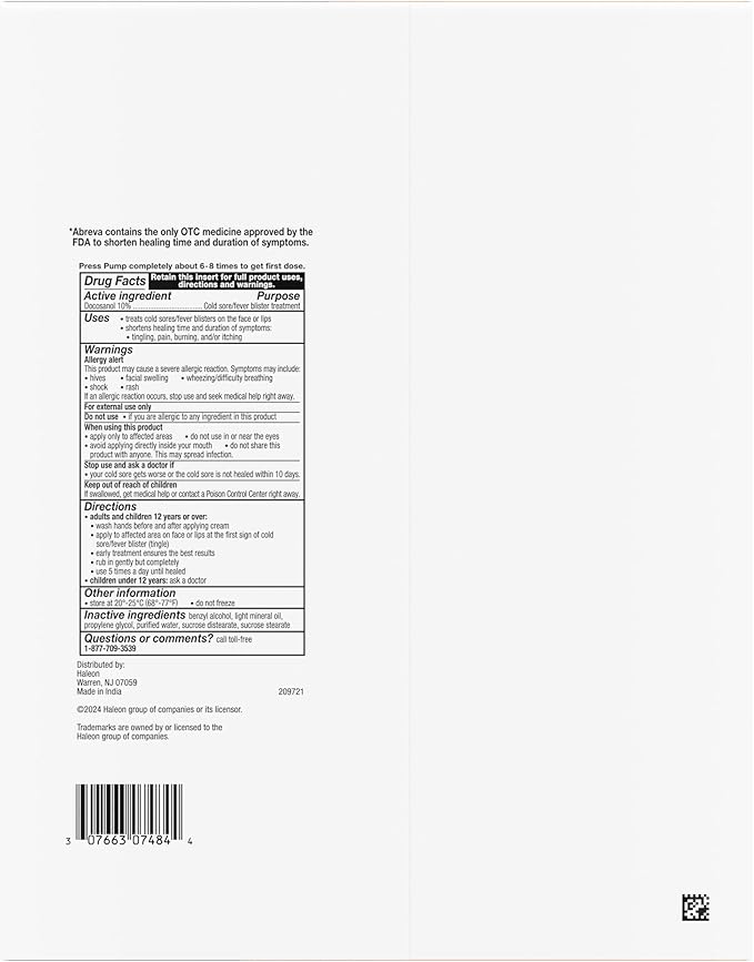 - Three 0.07 oz pump bottles of Abreva Docosanol 10% Cream Cold Sore Treatment