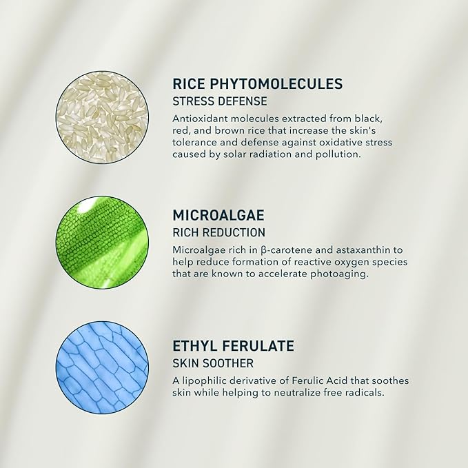 - ANTIOXIDANT SUPPORT: Rice phytomolecules boost skin resilience to UV and environmental stressors, while Microalgae, rich in β-carotene and astaxanthin, support visible skin improvements caused by photoaging. Ethyl Ferulate soothes while targeting impurities for healthier-looking skin
