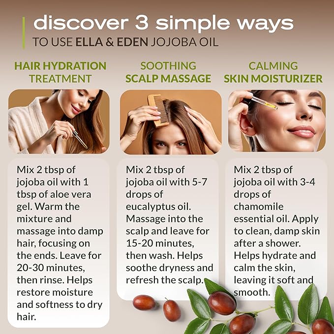 - Nourish Your Hair: Organic jojoba oil cold pressed works wonders as jojoba oil for hair. Reduce grease, add shine, and protect against split ends. Massage for jojoba oil for hair growth and a healthier scalp.