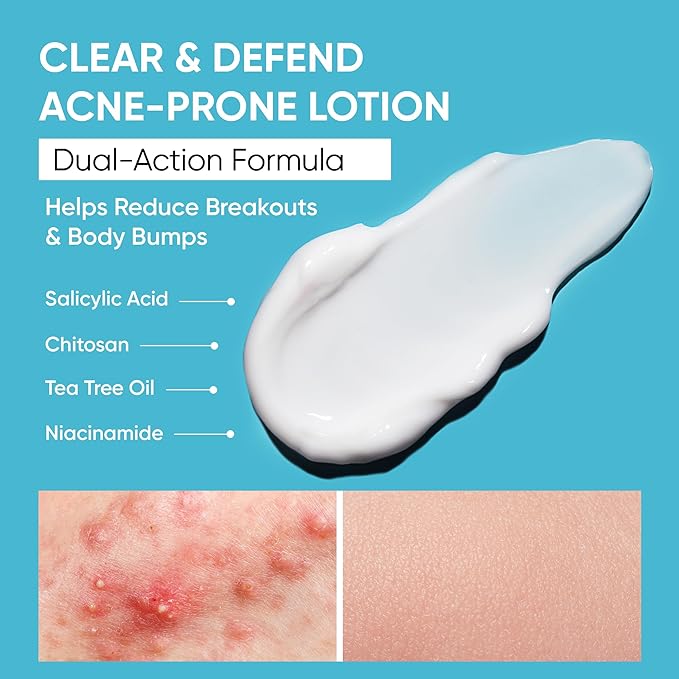 - Dual-Action Formula – Clears Acne & Prevents Recurrence: Formulated with 2% Salicylic Acid, Niacinamide, Chitosan, and Tea Tree Oil, this body acne lotion targets breakouts at the root. It clears clogged pores, reduces redness, and helps prevent future flare-ups—ideal for mild to moderate acne, butt bumps, and oily, acne-prone skin.