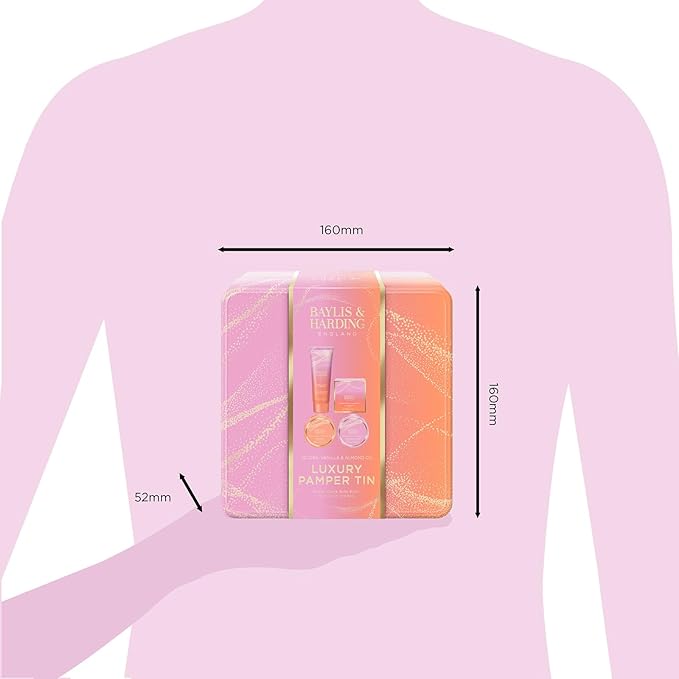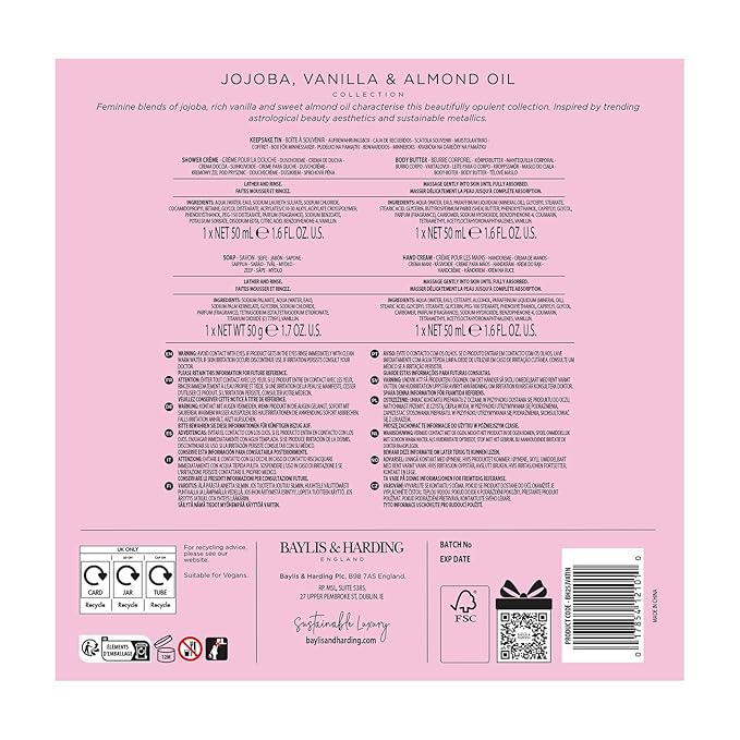- The ultimate, decadent selection of Bath and Body products in a Reusable, Feminine Tin Gift Set enriched with Jojoba, Vanilla & Almond Oil designed for a luxurious pampering experience