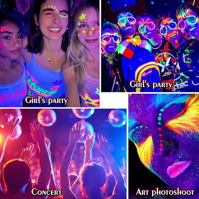 - ✨【Dual-Effect Shimmer & UV Neon】Experience vibrant eye makeup that transitions seamlessly from day to night. Under natural light, enjoy a sparkling shimmer effect; under UV light, watch as the neon pigments glow brightly, making your eyes the center of attention at parties, raves, or Halloween events.
