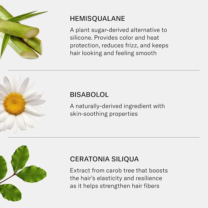- Hero Ingredients: Hemisqualane β a plant sugar-derived silicone alternative that reduces frizz, provides color and heat protection, and keeps hair smooth. Bisabolol β a naturally-derived ingredient that soothes skin. Ceratonia Siliqua β carob tree extract that boosts elasticity and strengthens hair fibers. Moringa Oleifera β horseradish tree extract that helps protect hair from pollution and UV damage. Squalane β a plant sugar-derived moisturizer that nourishes, restores luster, and adds shine and softness.