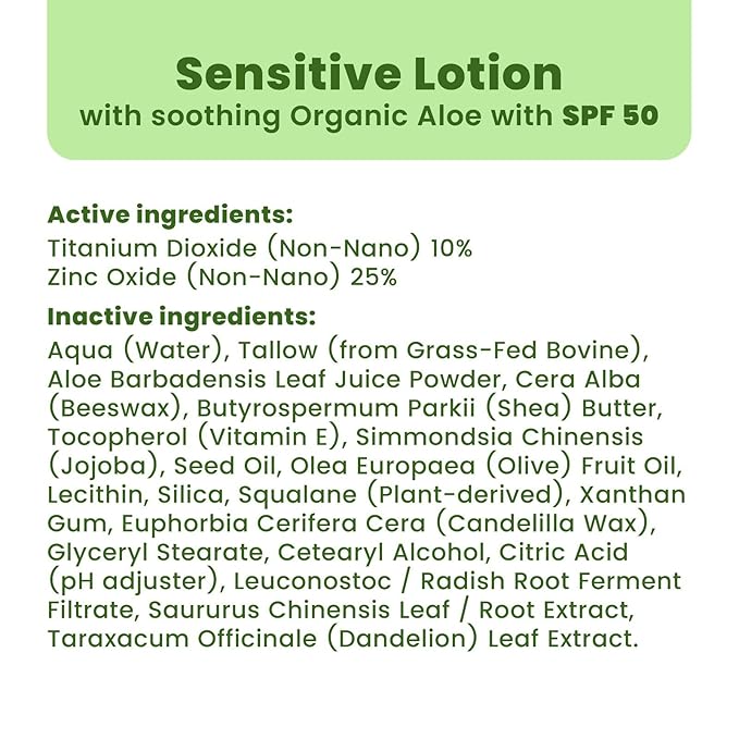 100% Mineral Sunscreen SPF 50 with Non-Nano Zinc Oxide — Reef Safe UVA/UVB Broad Spectrum Sunblock, Water Resistant 80 Min, Moisturizing Tallow Lotion for Face & Body, 3.4 fl oz