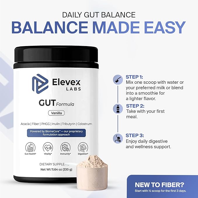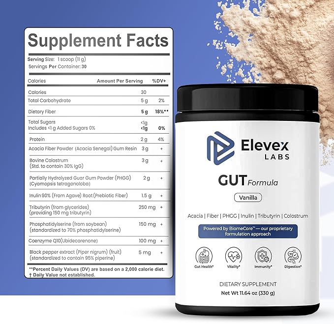 - BIOMECORE 3-WAY GUT SUPPORT — Elevex approaches gut health structurally using three key mechanisms: Colostrum (30% IgG) to support the gut lining, PHGG + Acacia Prebiotics for smooth digestion, and Tributyrin (Butyrate) to nourish the gut barrier and gut–brain signaling pathways.