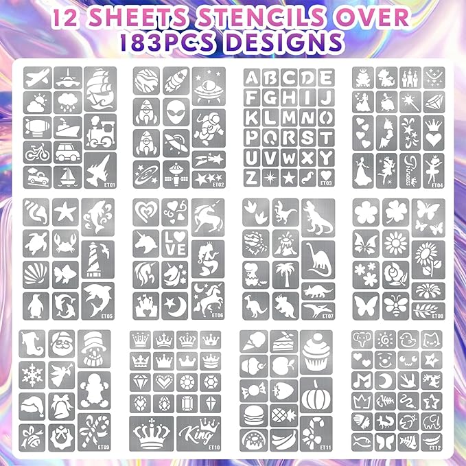 - Variety of Vibrant Colors: 12 different colors of body art pens temporary tattoo markers, bright and rich colors, includes 12 themes 183-pcs easy-to-use temporary tattoo stencils, both suitable for kid boy girl adult women men,youth and teen, let your creations have more colorful expression