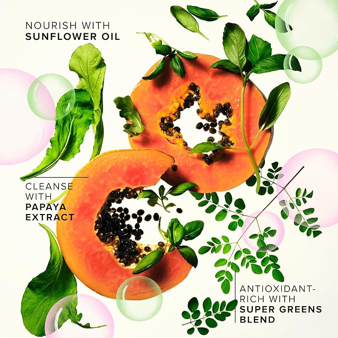 - New + Improved Formula - Sunflower + ginger root oils help to melt the most stubborn makeup without stripping or drying skin. Moringa extract removes impurities and sunscreen residue, while papaya enzymes naturally lift impurities from pores.