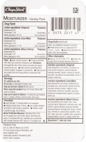 - LIP CARE WITH SUN PROTECTION: Keep your lips ultra-hydrated and protected from the sun’s rays. The ChapStick Moisturizer 2-in-1 Lipcare variety 3-pack includes Original, Black Cherry, and Cool Mint.