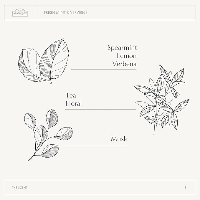- Fresh Mint & Verveine: A crisp, green aroma of wild mint and verbena, brightened by a whisper of citrus. Clean and revitalizing, like a breeze through a sunlit garden. Fragrance developed to meet strict European standards for skin health.