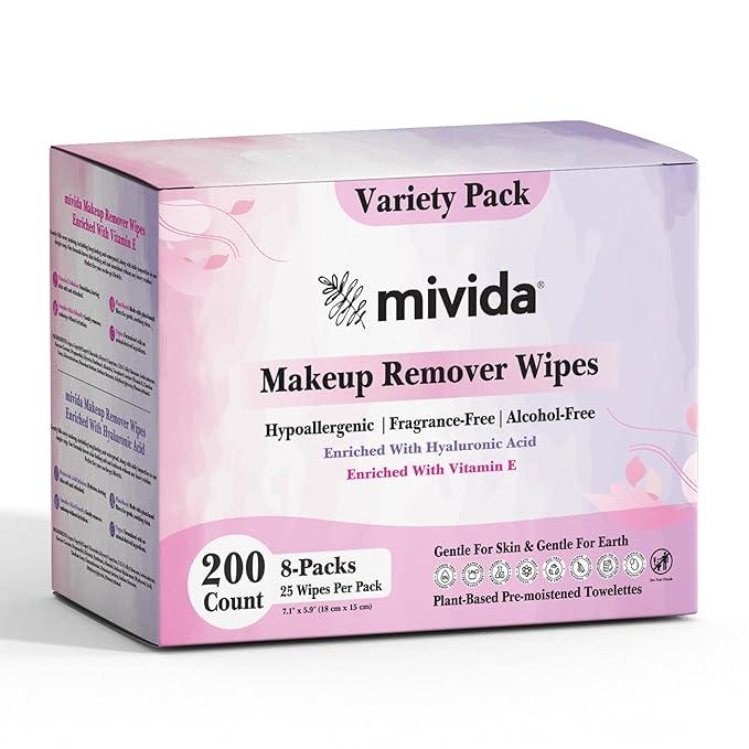 mivida Hypoallergenic Makeup Remover Wipes, Variety Box of 200 Wipes (8x25) 4 Packs with Vitamin E + 4 Packs with Hyaluronic Acid, Fragrance Free,Travel Size Plant-Based make up wipes