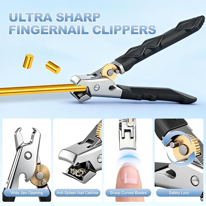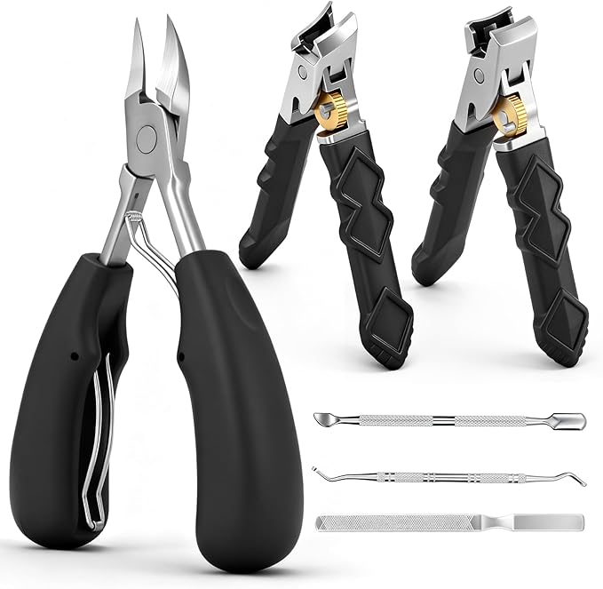 - Heavy-Duty Thickened Nail Clippers:Specifically designed for individuals with thick nails and ingrown nails. The 25-degree curved blades perfectly follow the nail's contour, precisely trimming ingrown nails and sharp edges. Sharp stainless steel blades paired with a 37mm extra-wide opening effortlessly handle thick, ingrown nails. Featuring ABS non-slip handles with an ergonomic design for a secure and comfortable grip. The ideal choice for all thick toenail care needs.