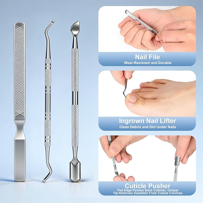- Thoughtful Service:This comprehensive nail care kit includes tools such as ingrown nail clippers, cuticle pushers, and ingrown nail files, helping you easily address ingrown nails, clean cuticles, and trim thick toenails. Thoughtfully designed, the kit is suitable for daily care or tackling stubborn nail issues for the elderly, men, and women alike, making it an ideal gift choice for friends and family. We provide round-the-clock customer support. If you have any concerns about product quality, please contact us through the Amazon platform.